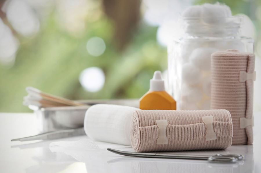 - De insteekplaatsen rond de pinnen beschermen met een droog compres, eventueel doordrenkt met bijvoorbeeld chloorhexidine in alcohol, dat dan snel opdroogt. Het compresje kan losjes rond de pin worden gedraaid en zachtjes aangeduwd.