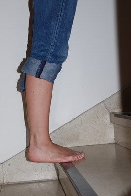 - Je voelt je Achillespees en voetboog uitrekken op het ogenblik dat je hiel van de grond komt: als je die spanning echt voelt, probeer dan die positie voor 10 seconden vol te houden en sta dan recht. 20 keer herhalen.